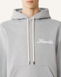 This sweatshirt features the Lanvin logo embroidered with a contrasting cotton ribbon, adding an elegant and timeless detail to a casual outfit. One of the House's signatures, it pays homage to Jeanne Lanvin, who saw the ribbon as a symbol of the love between a mother and daughter. This piece, which is made with a light and very comfortable fabric, can be worn with the matching jogging pants. Details - Lanvin ribbon hoodie in heathered fleece - Straight fit - Hooded neckline with a contrasting drawstring - Topstitched scarf detail on the back - Tapered and ribbed lower body - Ribbed cuffs - Kangaroo pocket - Embroidered and contrasting Lanvin logo - Made in Italy Size & fit - This style fits true to size, take your normal size - For more information, please see our size guide. Composition - Main fabric : 100% cotton knitted,100% cotton woven SKU: RM-HO0055-F047-P26100S
