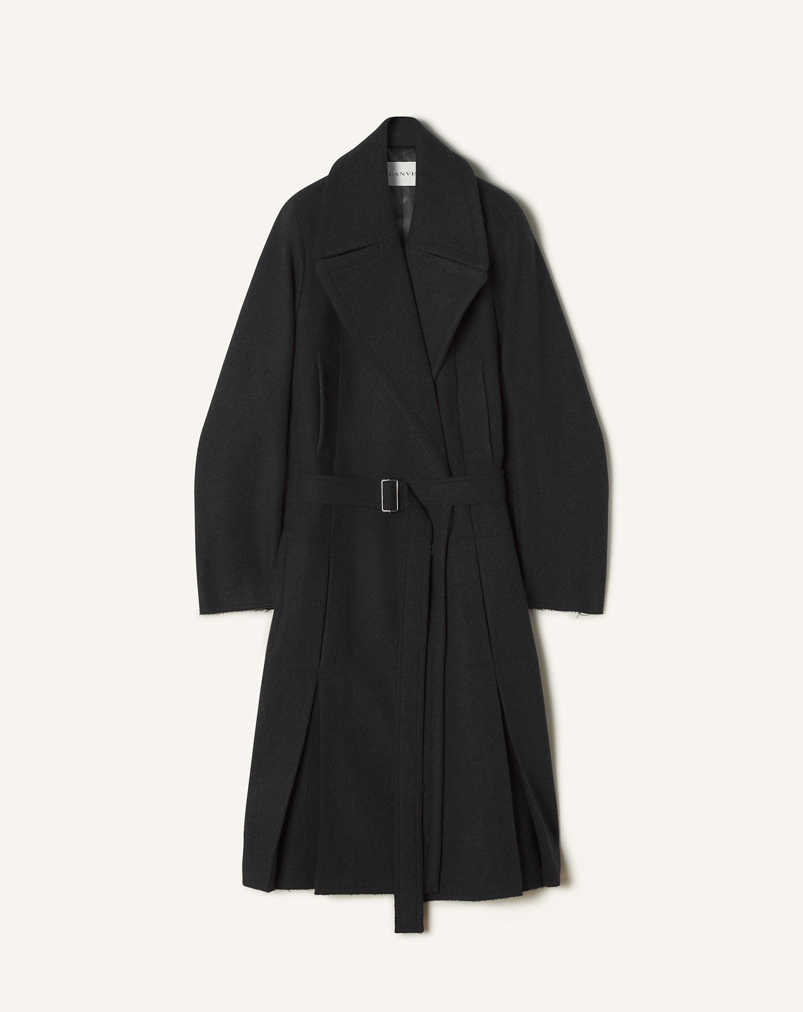This peacoat is crafted from Australian virgin wool, an elegant and timeless fabric. It embodies the vision of the Maison Lanvin and its passion for traditional tailoring. The straight lines of this coat create a sophisticated, contemporary silhouette. Details - Long oversized peacoat in compact mottled virgin wool - Lapel collar - Dropped shoulders - Pleats on front - Wool belt - Concealed double-breasted closure - Made in Italy Size & fit - For more information, please see our size guide. Composition - Main fabric : 100% virgin wool woven - Lining : 65% triacetate woven,35% cupro woven SKU: RW-CO0017-6120-H251834
