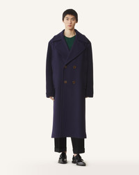 The cuts and proportions of the coats in this collection are inspired by the comfortable designs of the 1920s Car Coats. This coat features an oversized volume with a large collar, for a style that's both modern and elegant. The color was created exclusively for Lanvin. Details - Bi-material long peacoat - Loose fit - Knit sleeves - Collar with notched lapels - Double-breasted button closure - Cuffed sleeves - Two side pockets - Made in Italy Size & fit - For more information, please see our size guide. Composition - Main fabric : 100% virgin wool woven - Lining : 100% viscose woven SKU: RM-CO0008-4724-H2525646