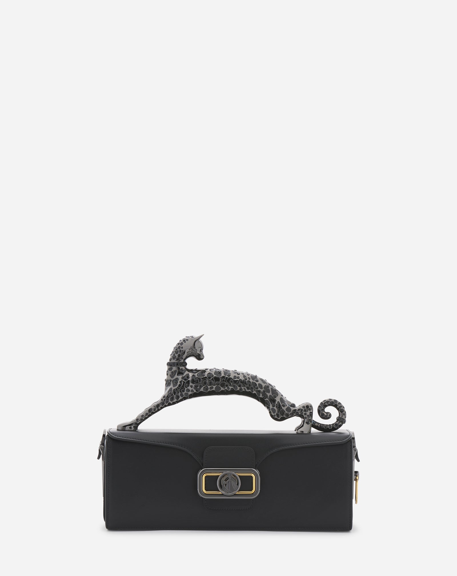 A unique collector's Lanvin bag, the Pencil Cat is embellished with a precious sculptural handle, inspired by an andiron belonging to Jeanne Lanvin designed by the French designer Armand-Albert Rateau. Details - Medium Pencil Cat bag in leather - Color: Black - Made in Italy Size and fit - L x H x W: 28 x 11 x 8 cm (11 x 4.3 x 3.1 in.) - Can be carried on the shoulder or in the hand - Handle: Lightweight electro-formed cat-shaped jewelry handle - Dual galvanized gold and ruthenium fastening - Removable shoulder strap with two metal hooks and an adjustable buckle - Decorative metal elements on the side - Inside patch pocket Composition - Main material: calfskin - Secondary material: brass - Material 3: zamak - Lining: calfskin Cleaning and care - Gently rub the leather with a damp cloth and a dab of suitable moisturizer. Wipe gently with a soft, dry cloth. - Gently clean the handle using a clean, soft cloth. Avoid using cosmetic, chemical or abrasive products. - Store in a dry, dark place in its original packaging. SKU: LW-BGBRS5-TPSS-A2310U