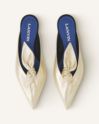 The Midnight Step bow mule in metallic leather embodies simplicity and refinement. The sleek, contemporary design echoes the lines of a subtly daring neckline, complete with a curved heel that is both stable and lightweight. The insole is hot-stamped with the House's signature in gold. This precious and elegant creation makes every step a gesture filled with character. Details - Midnight Step Mules with a metallic leather bow - Leather bow on the front - Lanvin logo hot-stamped in gold - Lanvin blue padded insole - Made in Italy Size & fit - This style fits true to size, you may take your usual size. - The size displayed corresponds to a French size SKU: FW-SHGA0A-META-H25M136