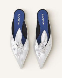 The Midnight Step bow mule in metallic leather embodies simplicity and refinement. The sleek, contemporary design echoes the lines of a subtly daring neckline, complete with a curved heel that is both stable and lightweight. The insole is hot-stamped with the House's signature in gold. This precious and elegant creation makes every step a gesture filled with character. Details - Midnight Step Mules with a metallic leather bow - Leather bow on the front - Lanvin logo hot-stamped in gold - Lanvin blue padded insole - Made in Italy Size & fit - This style fits true to size, you may take your usual size. - The size displayed corresponds to a French size SKU: FW-SHGA0A-META-H25M236