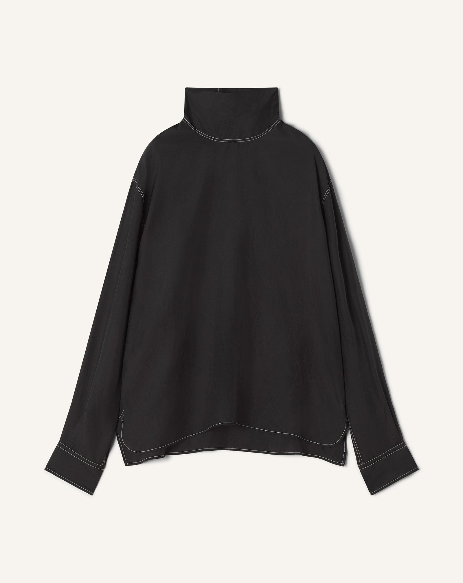 This top is crafted from soft, flowy silk. The mock neck and tapered cuffs create a modern and elegant silhouette, making it ideal for an evening outfit. Details - Mock neck top - Loose fit - Dropped shoulders - Buttoned cuffs - Two buttons at the back - Contrasting topstitching details - Made in Italy Size & fit - For more information, please see our size guide. Composition - Main fabric : 53% viscose woven,36% cotton woven,11% metal woven SKU: RM-TS0018-6185-H2510S