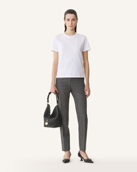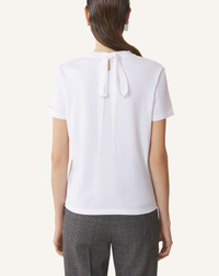 The Italian cotton used to craft this garment creates a luminous, soft, and resistant fabric. The ribbon tie on the back of this T-shirt, along with the Lanvin logo embroidered on the sleeve, adds a touch of femininity and elegance to a casual outfit. Details - Cotton T-shirt with knot detail - Straight fit - Round neck - Grosgain ribbon tie in the back - Lanvin logo embroidered in contrasting 3D-effect silver thread - Made in Italy Size & fit - For more information, please see our size guide. Composition - Main fabric : 100% cotton knitted SKU: RW-TS0024-J040-H2501XS
