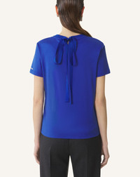 The Italian cotton used to craft this garment creates a luminous, soft, and resistant fabric. The ribbon tie on the back of this T-shirt, along with the Lanvin logo embroidered on the sleeve, adds a touch of femininity and elegance to a casual outfit. Details - Cotton T-shirt with knot detail - Straight fit - Round neck - Grosgain ribbon tie in the back - Lanvin logo embroidered in contrasting 3D-effect silver thread - Made in Italy Size & fit - For more information, please see our size guide. Composition - Main fabric : 100% cotton knitted SKU: RW-TS0024-J040-H25251XS
