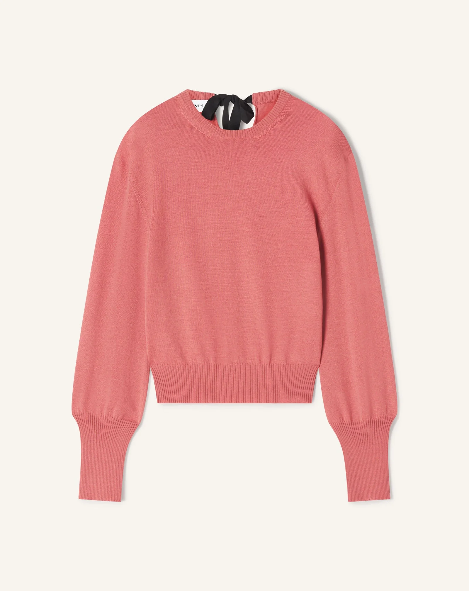 This merino wool sweater features a grosgrain ribbon on the back, inspired by the House's archives, for a feminine and elegant touch. The simple, rounded lines add a touch of elegance to a casual daytime outfit. Details - T-shirt sweater in wool with a grosgrain detail - Straight fit - Round neck - Grosgrain ribbon to be tied at the back, featuring an embroidered Lanvin logo - Ribbed lower body - Tapered cuffs - Made in Italy Size & fit - This style fits true to size, take your normal size - For more information, please see our size guide. Composition - Main fabric : 97% wool knitted,100% polyester knitted,2% polyamide knitted,100% polyester knitted,1% viscose knitted,100% polyester knitted SKU: RW-PO0016-K101-P26597XS