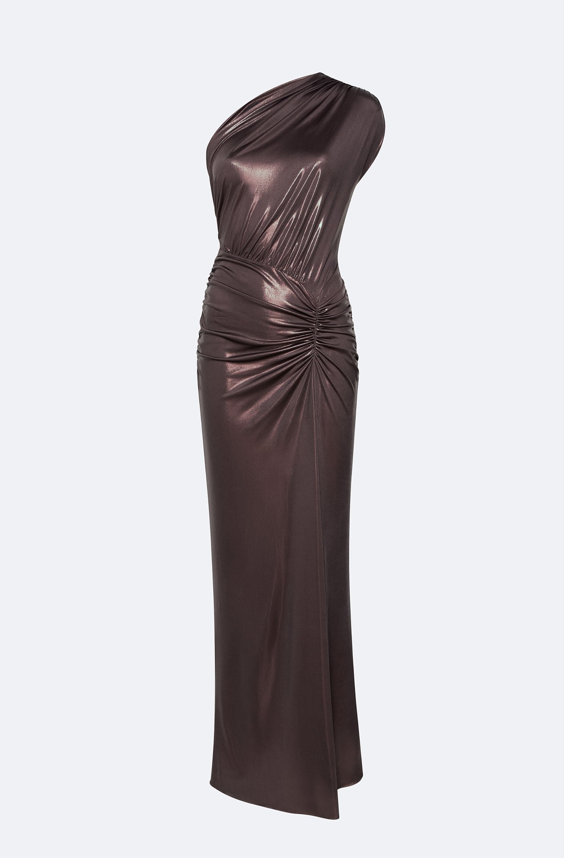 Featured In The Pre Fall 2025 Collection One shoulder maxi dress in our bestselling coated jersey. Features ruched detail throughout the body. - Material: 93% Polyester, 7% Elastane - Care: Hand Wash Cold or Dry Clean - Fit: True to size - Model is 5'10 and Wearing a Size S
