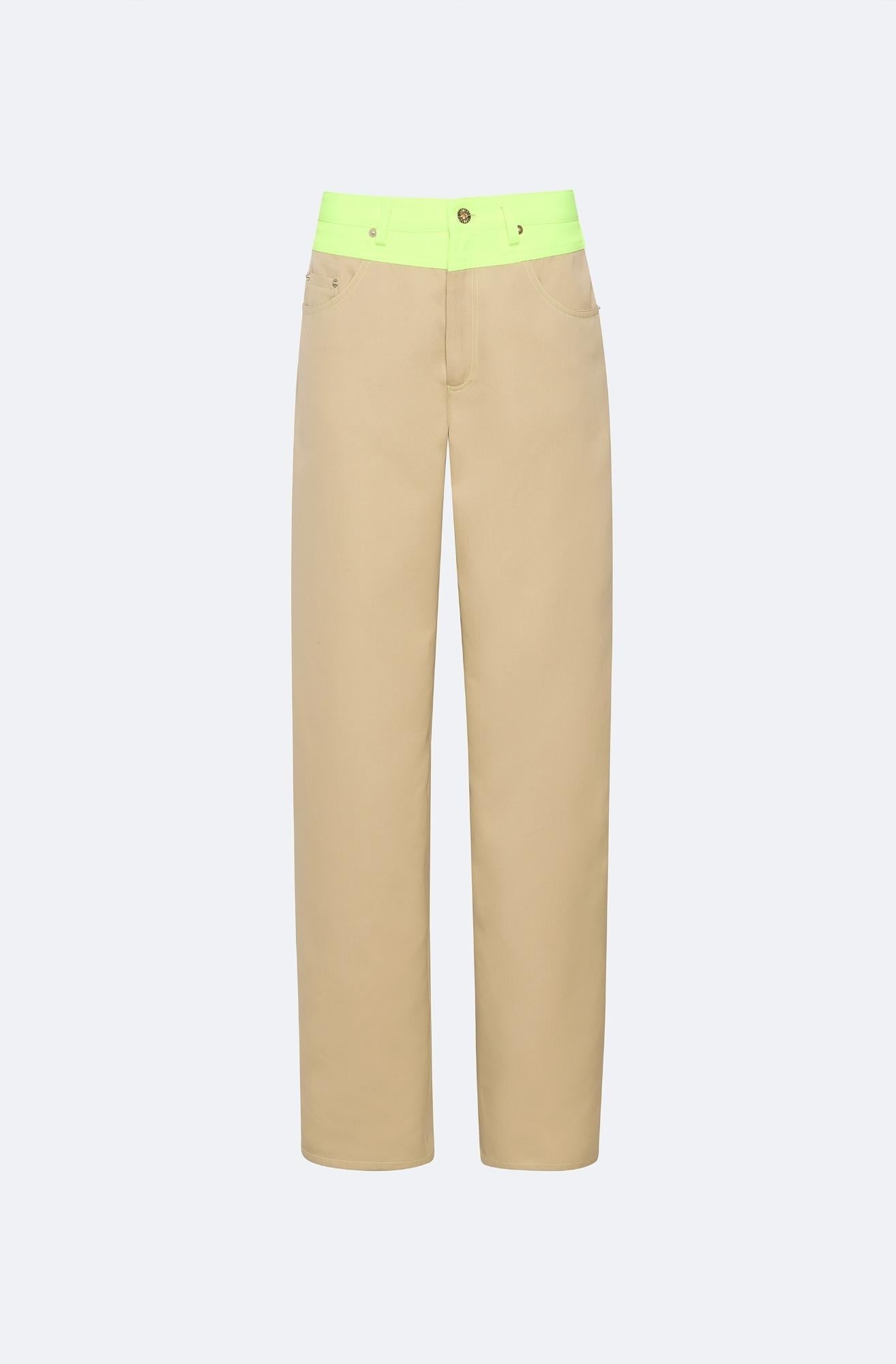 Featured in the Spring 25 Collection Double seam pant in our everyday cotton. Upper waist features a pop of neon with the majority of the body grounded in a neutral khaki. Button front zip-closure and back pockets.. - Material: 56% Recycled Polyester 42% Cotton 2% Polyamide - Fit: Relaxed Fit. True to Size - Care: Machine Wash Cold or Dry Clean - Model is 5'10'' and Wearing a size 2