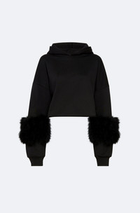 Featured in the Holiday Gift Guide Collection Sweatshirt in a comfortable, everyday cotton fabrication. Raw hemline for a slightly cropped fit. Feathers at the arms. Pair back to the cotton cargo sweatpants for the full look. - Material: 100% Cotton - Trim: 100% Marabou Feathers - Care: Clean by Fur Specialist Only - Fit: True to size. - Model is 5'9 and Wearing a size Small