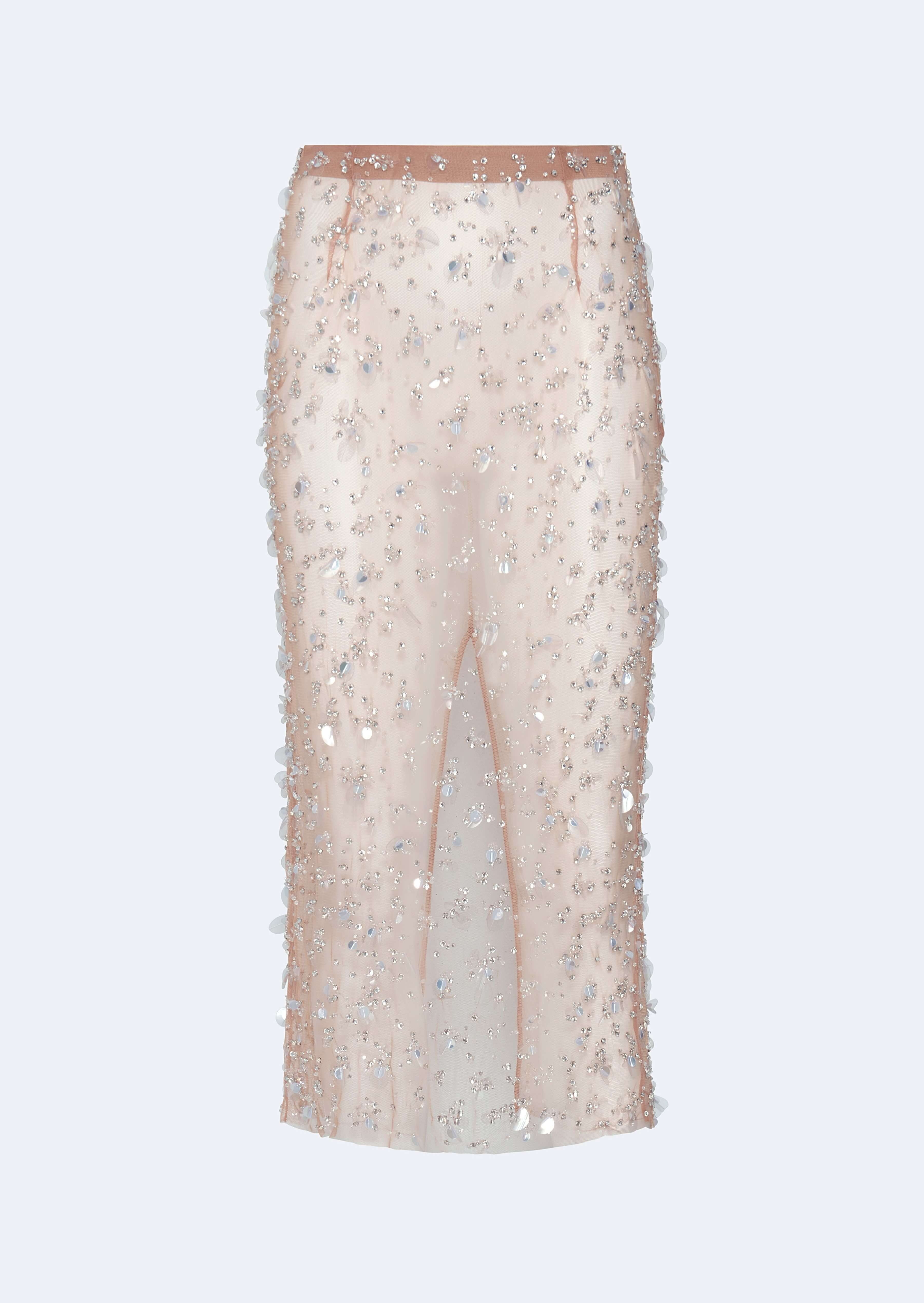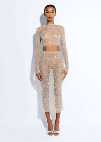 Featured in the Resort 25 Collection Sheer midi skirt in our embroidered mesh fabrication. Style seamlessly hugs the body and shines with all over embroidery. - Material: 100% Nylon - Care: Dry Clean Only - Fit: True to size - Model is 5'10 and Wearing a size 2