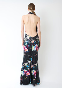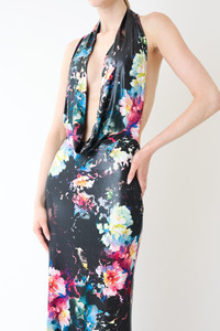 Floral maxi gown cowl neck gown in our ultra-comfortable lightweight jersey fabrication. Features a deep halter neckline. - Material: 94% Polyester, 6% Spandex - Care: Hand Wash or Dry Clean - Fit: True to size. - Model is 5'10 and Wearing a size Small