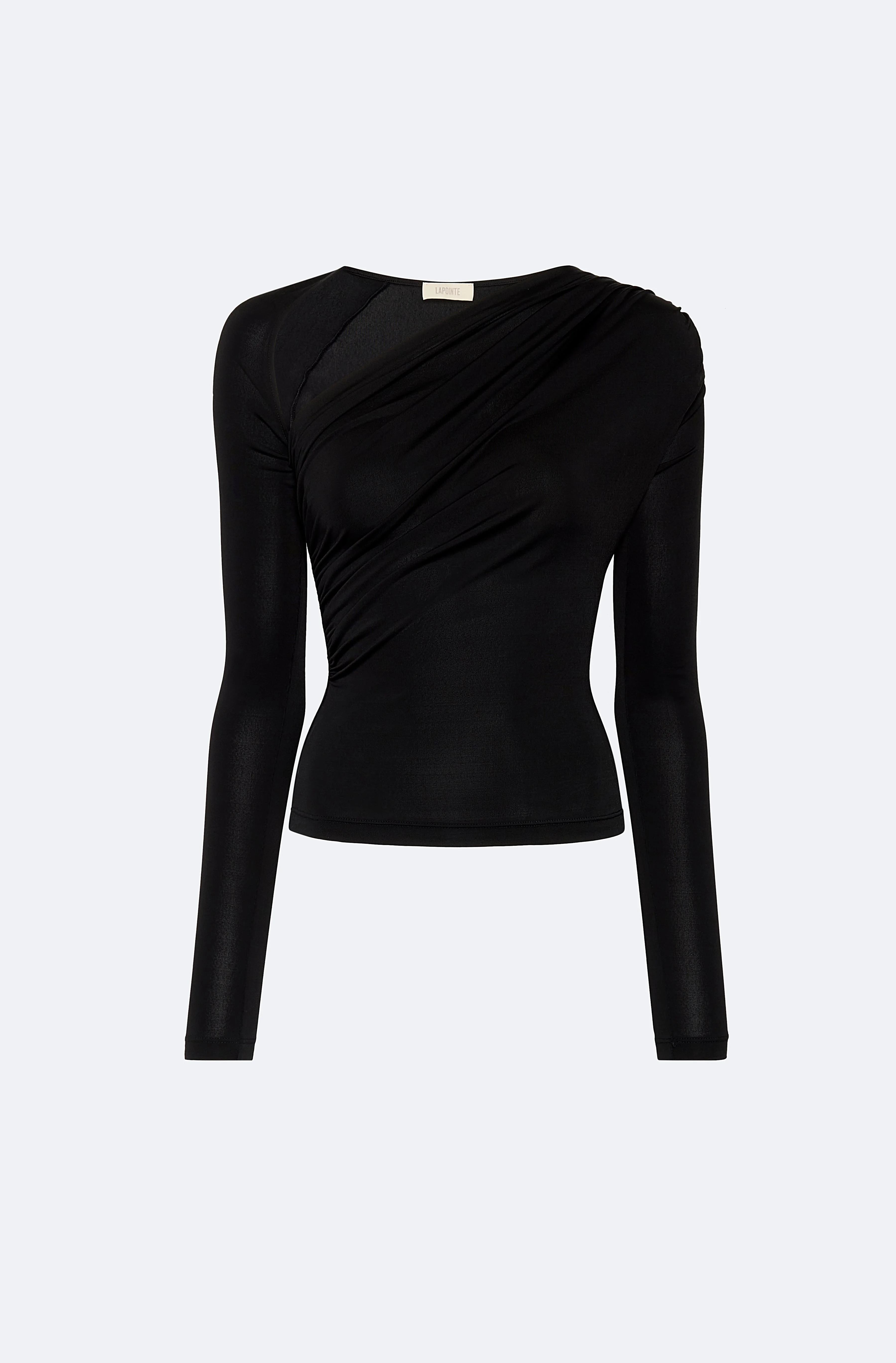 Featured In The Fall 2024 Collection This lightweight jersey slim top features an asymmetric neck line with ruched details throughout. - Materials: 61% Acetate, 39% Viscose - Care: Hand Wash Cold or Professional Dry Clean - Fit: Slim Fit. True to Size - Model is 5'10" and Wearing a S