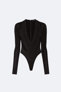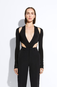 V-neck bodysuit in our new, ultra flattering compact jersey. Features cutouts at the shoulders and waist. Invisible zipper at the back and snap closure. - Material: 94% Acetate, 6% Elastane - Care: Hand Wash Cold or Dry Clean - Fit: True to size. For a more relaxed fit, size up. - Model is 5'10 and Wearing a size Small