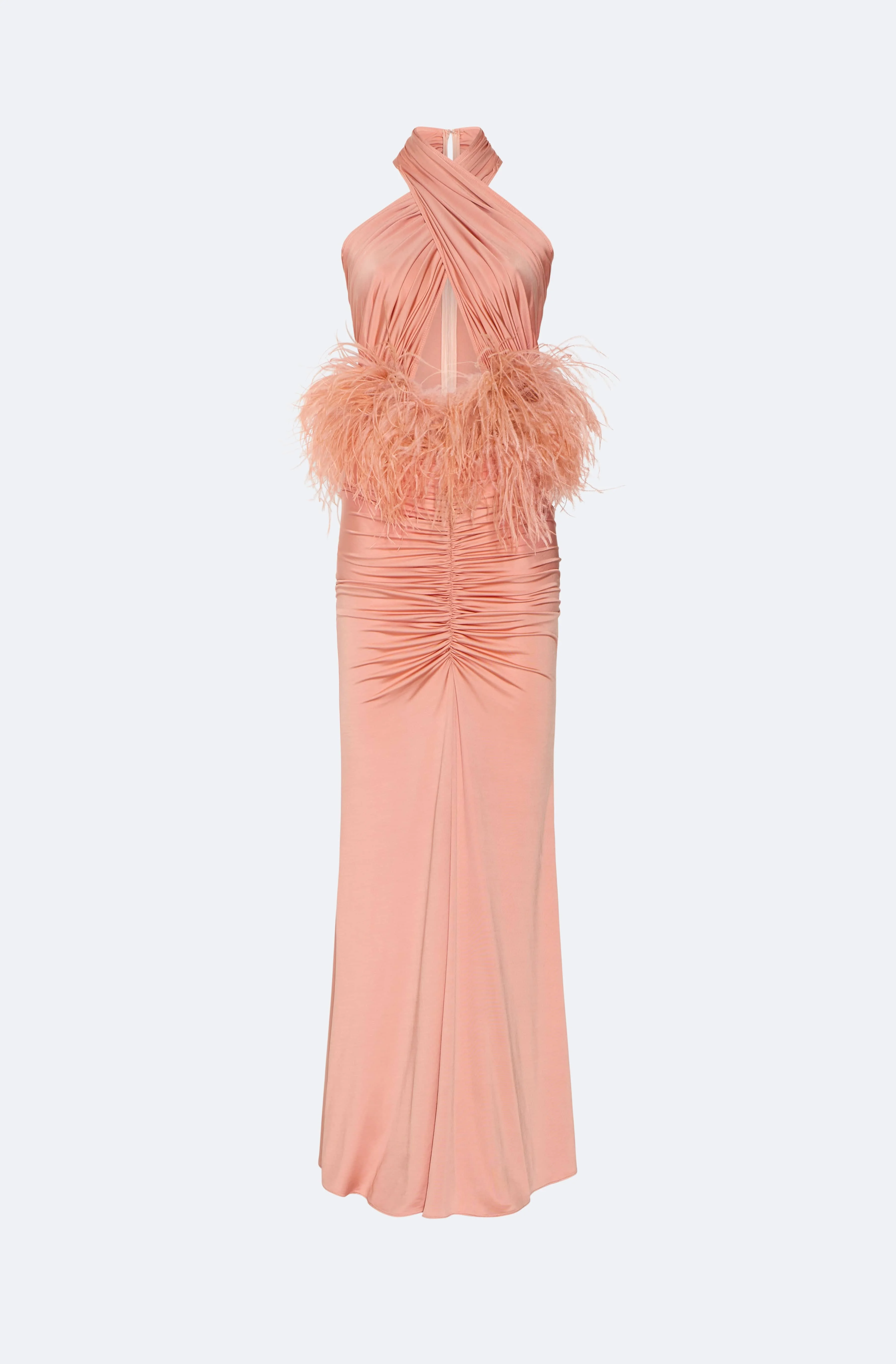 Jersey Sleeveless Halter Ruched Gown With Feathers