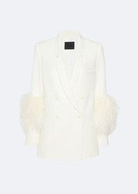 Featured in the Holiday 25 Collection Double breasted blazer in our bestselling matte crepe fabrication. Features notched lapels and a front button closure. - Material: 90% Polyester, 10% Elastane - Trim: 100% Ostrich Feathers - Care: Dry Clean Only - Fit: True to size. - Model is 5'9 and Wearing a size 2