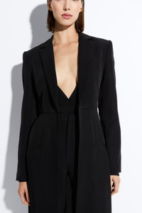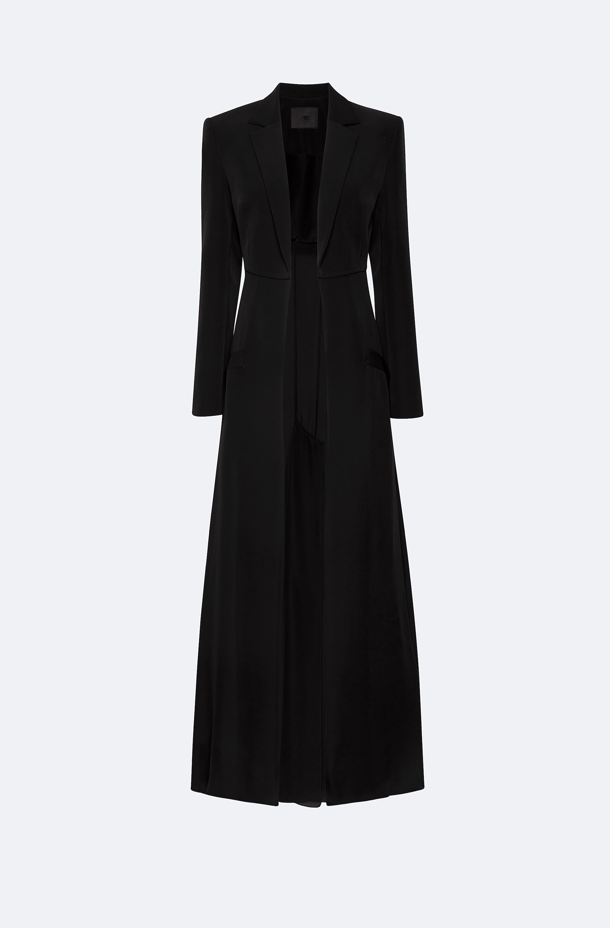 Combo jacket in two of our bestselling fabrications. Upper, blazer style body made up of matte crepe fabric with lightweight georgette flowing throughout the rest of the style. - Material: 90% Polyester, 10% Elastane - Care: Hand Wash Cold or Dry Clean - Fit: True to size. - Model is 5'10 and Wearing a size 2