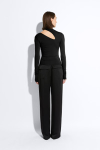 Asymmetric top in our bestselling matte viscose. Features a cutout at the shoulder and our signature longer length sleeves that allow you to stack them at the wrist. - Material: 83% Rayon Viscose, 17% Elite Polyester - Care: Hand Wash Cold or Dry Clean - Fit: True to size. - Model is 5'10 and Wearing a size Small