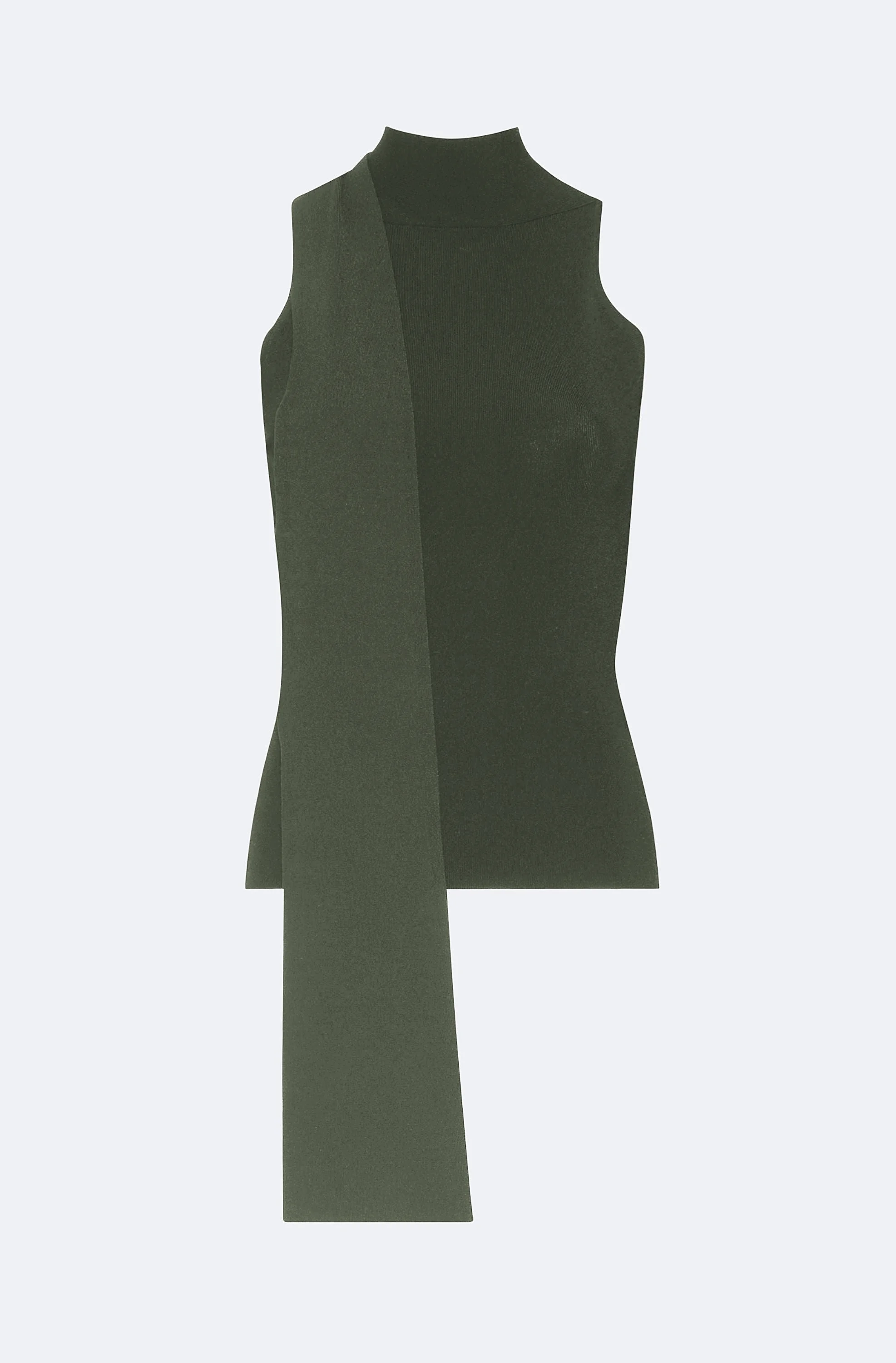 Sleeveless high neck halter top in our crepe matte viscose fabric. Features keyhole opening at back neck, tie closure, and long sash ties. - Material: 83% Rayon Viscose, 17% Elite Polyester - Care: Hand Wash Cold or Dry Clean - Fit: True to size - Model is 5'10 and Wearing a Size S