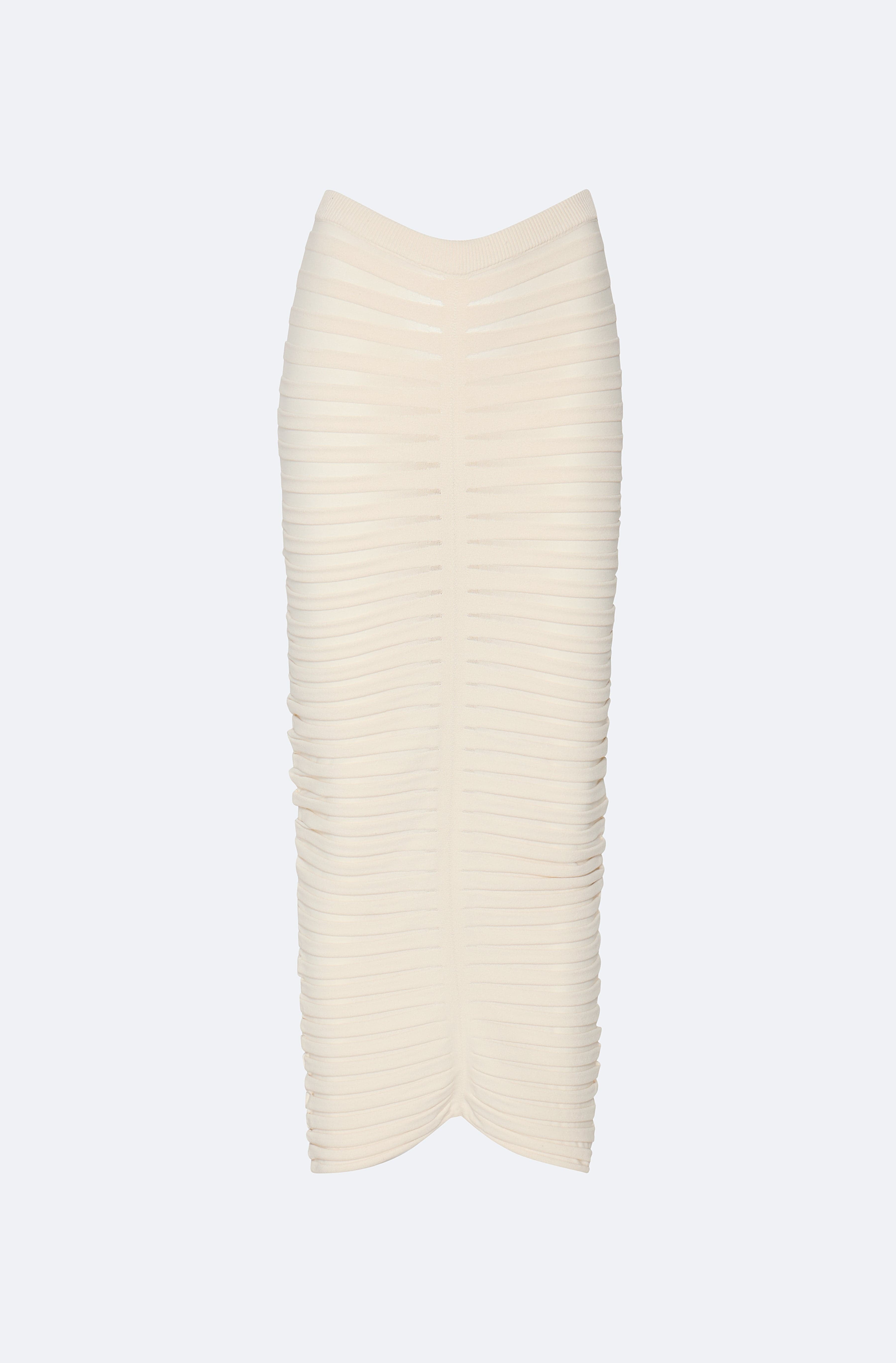 Featured in the Holiday 25 Collection Ribbed Skirt In Our Bestselling Matte Viscose Fabrication. Semi Sheer Style With A Peaked Hemline. Stretch In Fabric For Easy Wear. - Material: 83% Rayon Viscose, 15% Elite Polyester - Fit: True to Size - Care: Hand Wash or Dry Clean - Model is 5'11" and Wearing a size Small