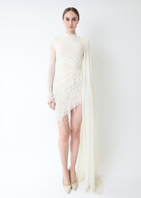 Mesh High Neck Cape Dress With Feathers