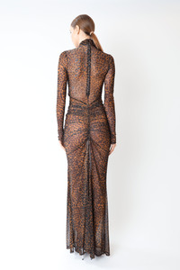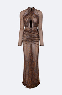 Mesh halter neck gown in our new custom leopard print featuring a center-front cutout and ruching throughout. Fastens with invisible zipper at center back. - Materials: 995% Polyester, 5% Elastane - Care: Dry Clean Only - Fit: True to Size - Model is 5'10" and Wearing a S