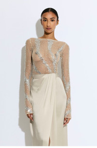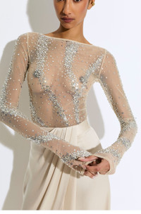 Our bestselling, long sleeve bodysuit elevated in a sheer, delicate rhinestone swirl embroidery. Features zipper at back neck and button closure. - Material: 82% Polyamid, 18% Elastane - Care: Hand Wash Cold or Dry Clean - Fit: True to size - Model is 5'10 and Wearing a size 2