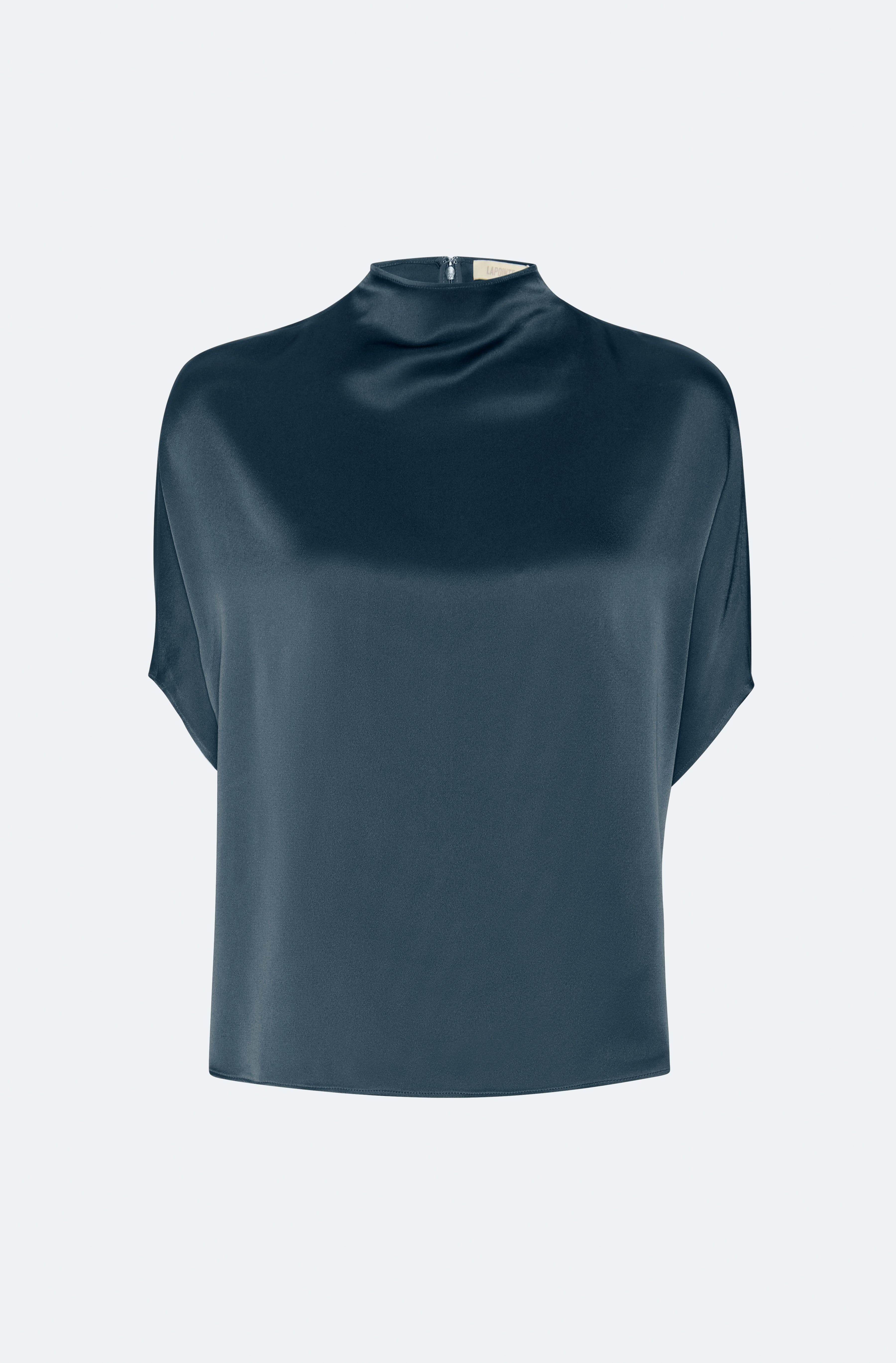 Featured in the Resort 25 Collection Cape tee in our luxurious doubleface satin fabrication. Easy body allows this style to be tucked into pants and skirts. Invisible zipper at the back. - Material: 61% Acetate, 39% Viscose - Fit: True to Size - Care: Professional Dry Clean Only - Model is 5'11" and Wearing a size Small