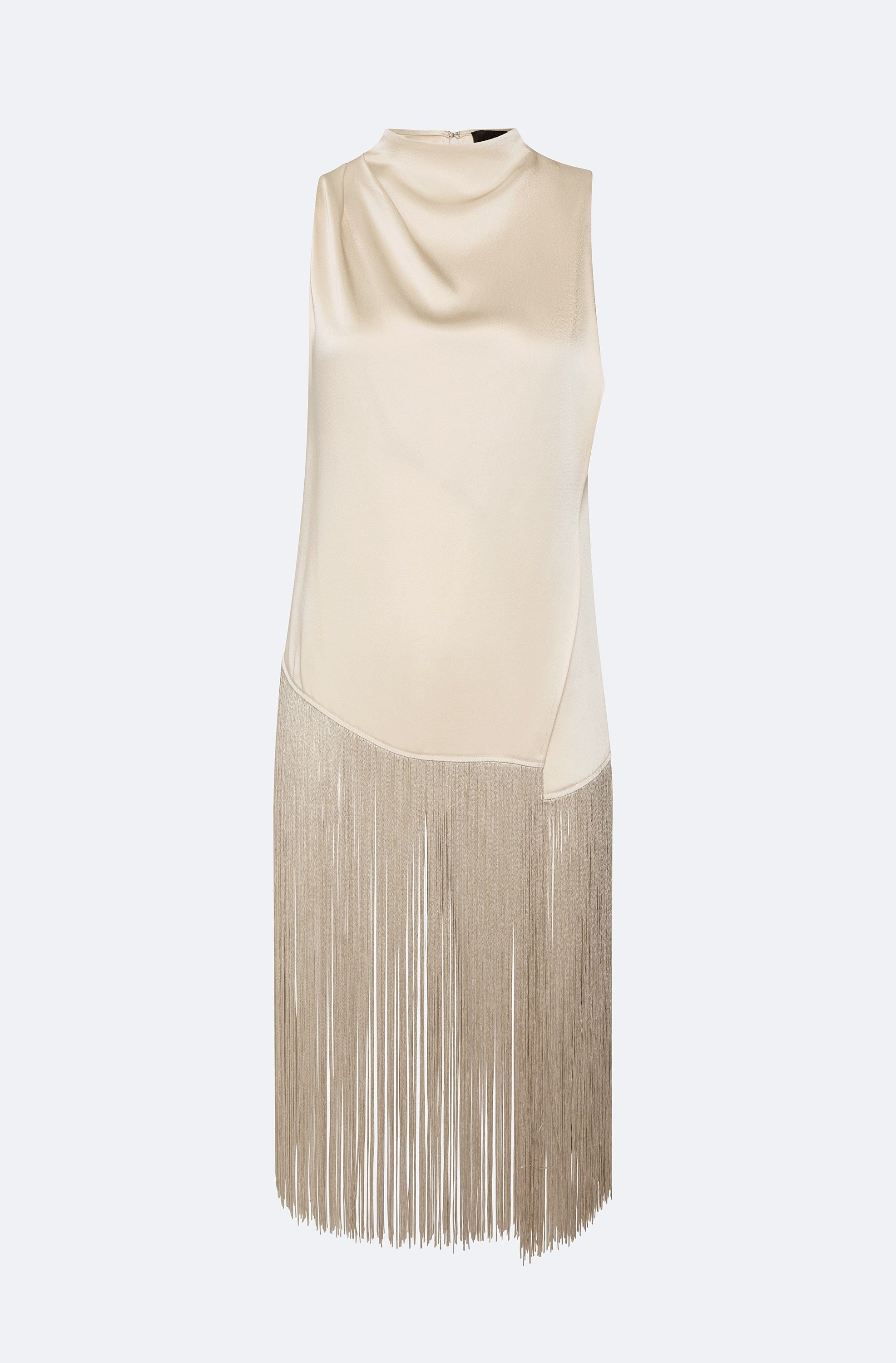 Sleeveless fringe top in our luxurious doubleface satin. Features an asymmetric hem with fringe trim. Fastens with back center zip closure. - Material: 61% Acetate, 39% Viscose - Care: Hand Wash Cold or Dry Clean - Fit: True to size - Model is 5'10 and Wearing a Size 2