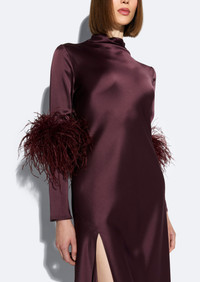Featured In The Fall 2024 Collection This doubleface satin dress features a draped neck with long sleeves, slit detail and feathers on the sleeves. - Materials: 61% Acetate, 39% Viscose, 100% Real Ostrich Feathers - Care: Professional Care Only - Fit: True to Size - Model is 5'10" and Wearing a 2
