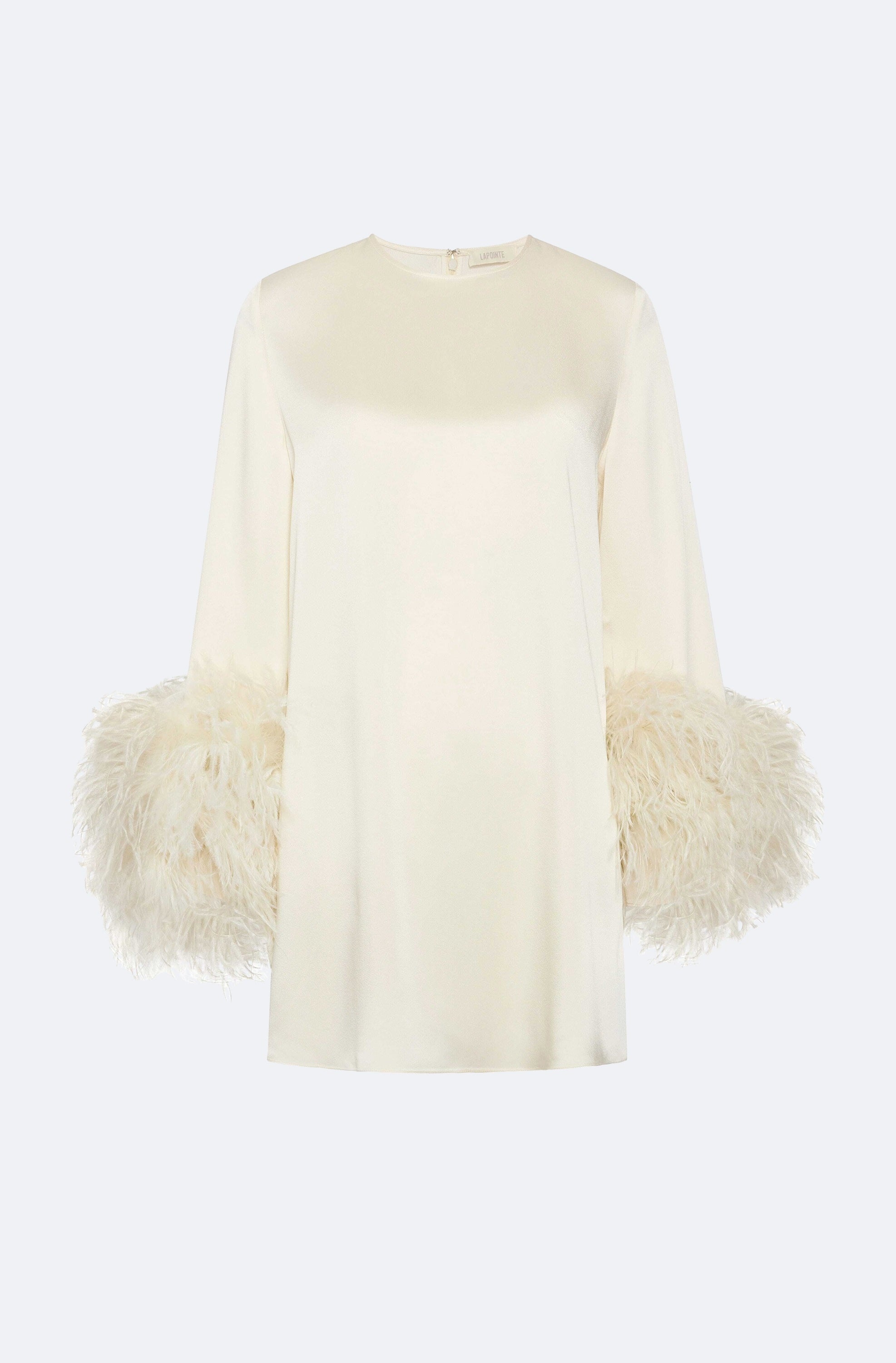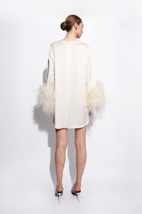 Featured in the Spring 25 Bridal Collection Shift dress in our luxurious doubleface satin. Features feathers at the wrist. - Material: 61% Acetate, 39% Viscose - Trim: 100% Ostrich Feathers; Dyed Ostrich Feather, Struthio Camelus, Republic of South Africa - Care: Professional Dry Clean Only - Fit: Oversized. Size Down For A Slimmer Fit. - Model is 5'10" and Wearing a S
