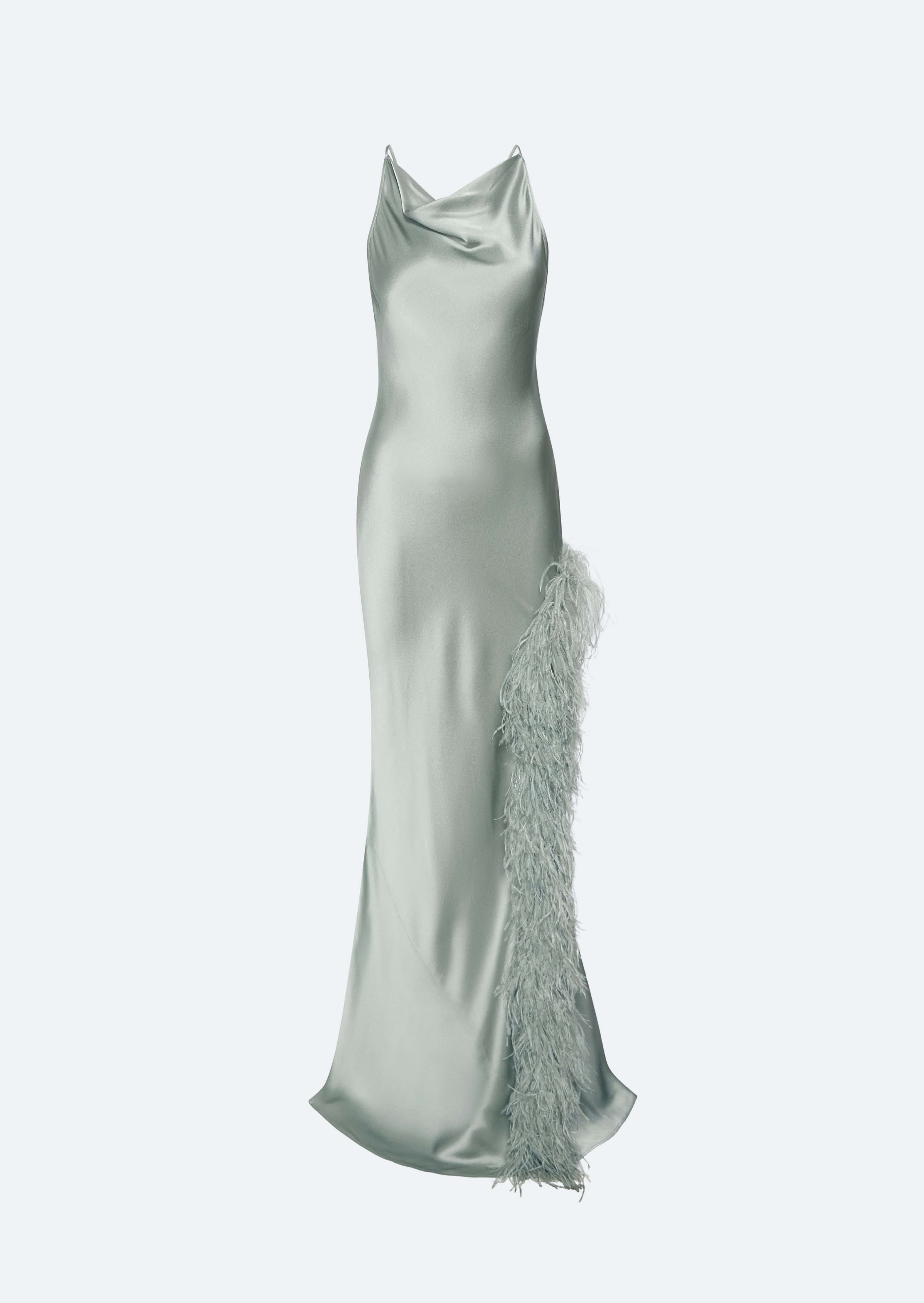 Halter gown in our luxurious doubleface satin. Features a cowl neckline and slit at the front with feathers. - Material: 61% Acetate, 39% Viscose - Trim: 100% Ostrich Feathers; Dyed Ostrich Feather, Struthio Camelus, Republic of South Africa - Care: Professional Dry Clean Only - Fit: Oversized. Size Down For A Slimmer Fit. - Model is 5'10" and Wearing a S