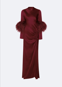 Draped neck gown in our luxurious doubleface satin with feathers on sleeves. Features a shirred tab for adjustable coverage and zipper at center back. - Material: 61% Acetate, 39% Viscose, 100% Struthio Camelus - Care: Dry Clean Only - Fit: This style is cut on the bias and has a naturally looser drape. Size down if you’re between sizes or prefer a more fitted silhouette - Model is 5'10 and wearing a size 2