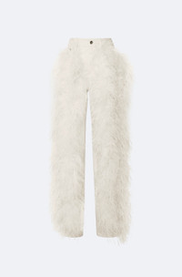 Denim pants in our everyday stretch cotton twill. Features feathers down the side of the leg and zip-front button closure. Sits at the natural waist. - Material: 98% Cotton, 2% Elastane - Trim: 100% Ostrich Feathers; Struthio Camelus, Republic of South Africa - Care: Professional Dry Clean Only - Fit: True to size - Model is 5'10" and Wearing a S