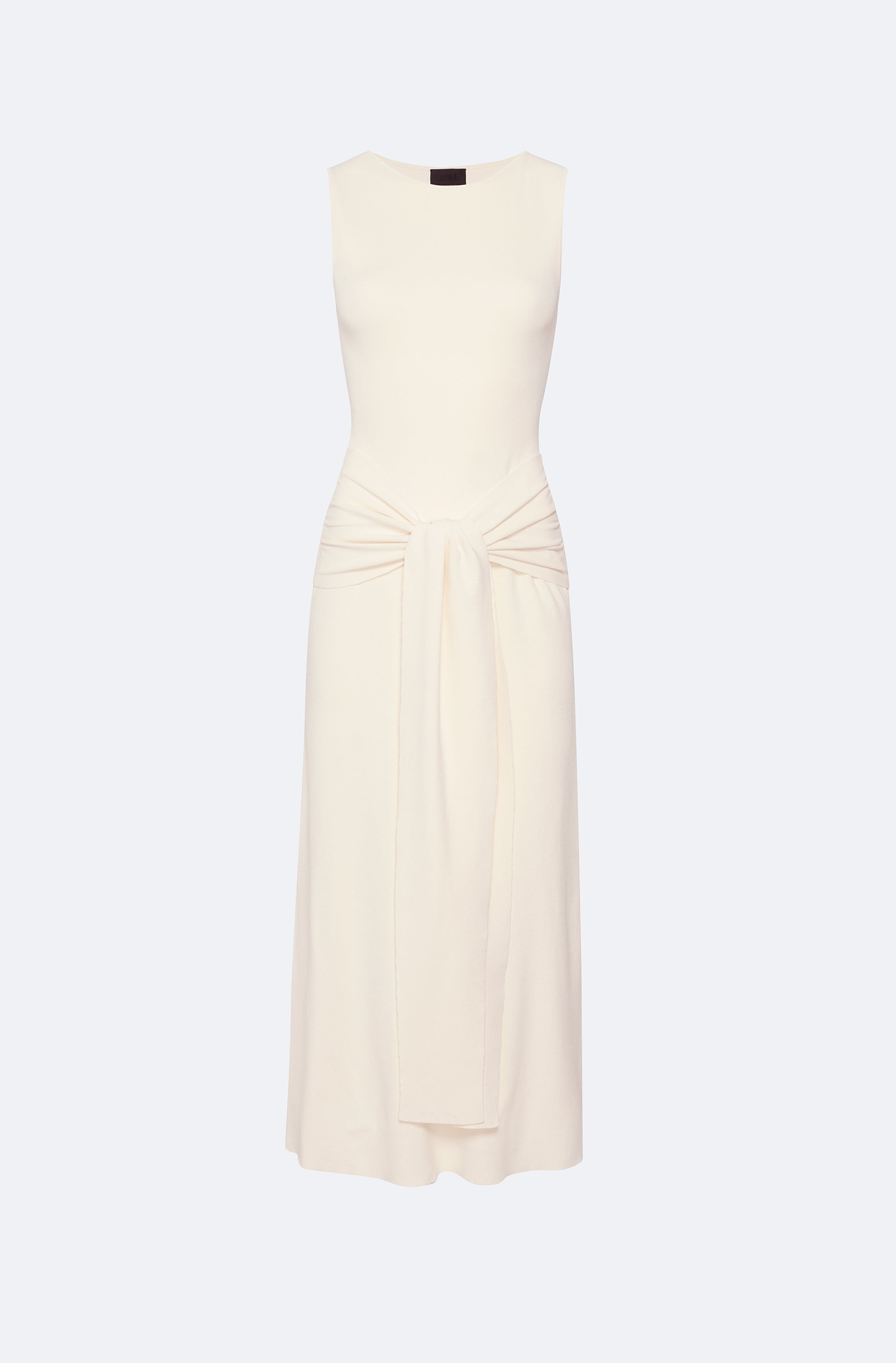 Featured in the Holiday 25 Collection Matte viscose midi Dress with boat neckline and adjustable center front tie at the waist. - Material: 83% Rayon Viscose, 15% Elite Polyester - Fit: True to Size - Care: Hand Wash or Dry Clean - Model is 5'11" and Wearing a size Small