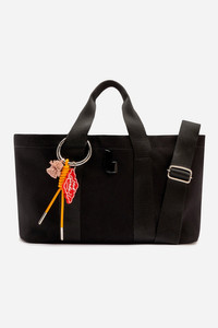 The Americana Tote brings a cool, laid-back feel to everyday style. Crafted in durable canvas with sporty straps and a statement key-ring charm, it blends practicality with a modern edge. Spacious, lightweight, and built for real life, it fits your laptop, daily essentials, and then some—making it the ultimate carry-all for city days, airport runs, and weekend plans. Pair it with relaxed denim and an oversized button-down for a quietly confident look. Made possible by Allca. - Black - Denim - Leather and rubber charms - Larroude "L" logo in black hardware - Includes a removable long handle drop