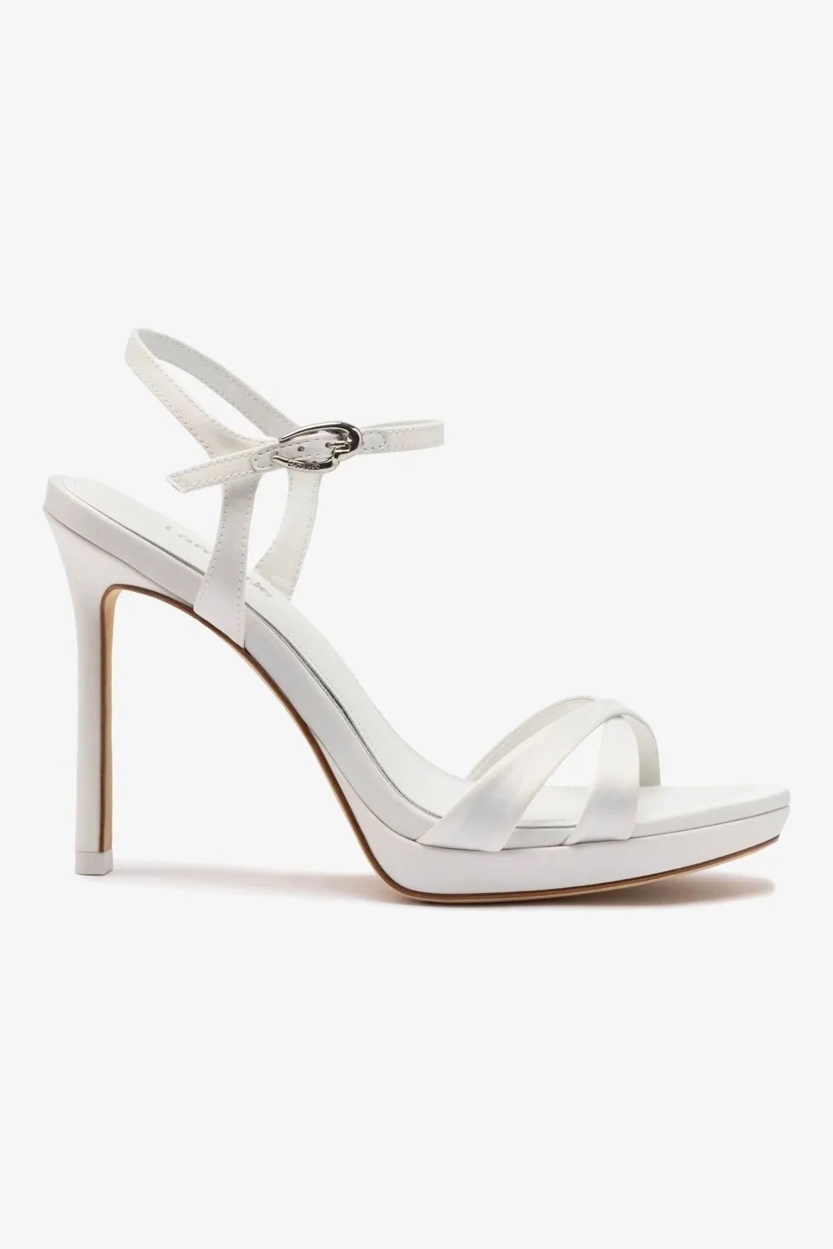 A silhouette as classic and elegant as its namesake, the Angelina features a criss-cross front set on a subtle platform that makes this new satin heel an indispensable addition. - White - Satin fabric - Open round toe - Adjustable ankle strap - 4.1 inch stiletto heel - Finely crafted leather sole for support, durability, and comfort - Insole with memory foam cushion and hot stamp logo - Peel off the protector before using your shoe - Handmade in Brazil