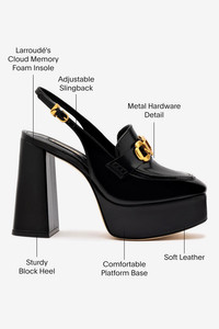 Reach new heights in this bold take on the classic loafer. Set on a sky-high platform and finished with a sleek slingback strap for a modern twist—and a secure fit—it's equal parts power move and everyday essential. - Black - Glossy box leather - Closed round toe - Adjustable ankle strap - Larroude "L" logo in golden hardware - 4.5 inches block heel - 2 inches platform - Finely crafted leather sole for support, durability, and comfort - Insole with memory foam cushion and hot stamp logo - Peel off the protector before using your shoe - Handmade in Brazil - SKU: L217-HARR-BLAC-2242