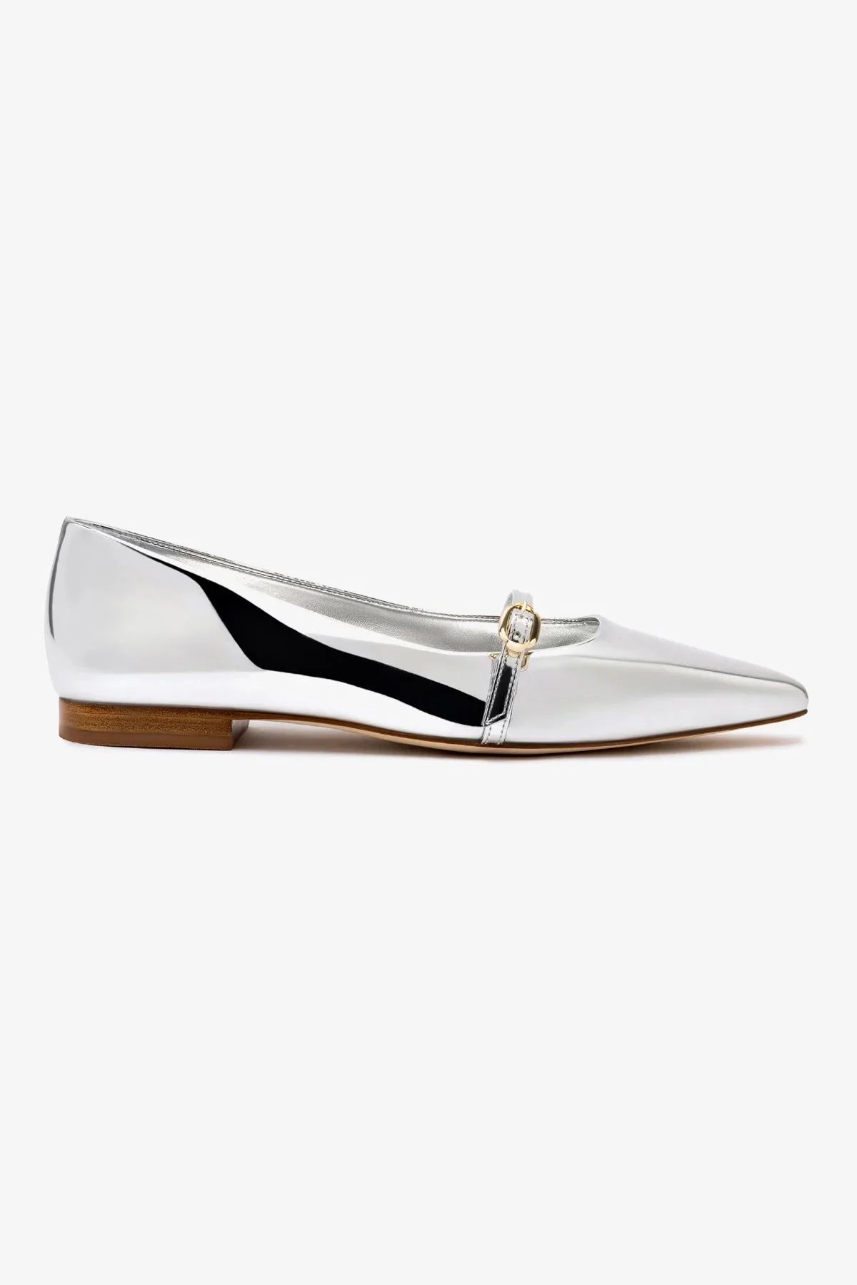 A glam new flat to add to the assortment, the Irene takes cues from the Grace silhouette in a day-to-night flat that is well-suited for wear all year long. - Silver - Mirror synthetic - Closed pointed toe - Golden hardware - Finely crafted leather sole for support, durability, and comfort - Insole with memory foam cushion and hot stamp logo - Peel off the protector before using your shoe - Handmade in Brazil