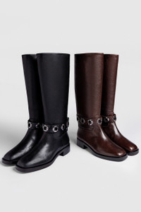 The Milan Boot is a classic that reinvents itself, with a tall shaft and a flat design that ensures total comfort. The detail that transforms it is the removable strap with the signature Daisy buckles, adding a cool and unexpected touch to this timeless silhouette. Wear it with the buckle strap to add a touch of attitude to mini skirts and dresses, or remove the strap for a more classic and minimalist look with jeans and tailored pants. - Brown - Napa antique leather - Closed round toe - Silver hardware - Removable strap - 1 inch block heel - Finely crafted leather sole for support, durability, and comfort - Insole with memory foam cushion and hot stamp logo - Peel off the protector before using your shoe - Handmade in Brazil - SKU: L302-MILA-BROW-2309