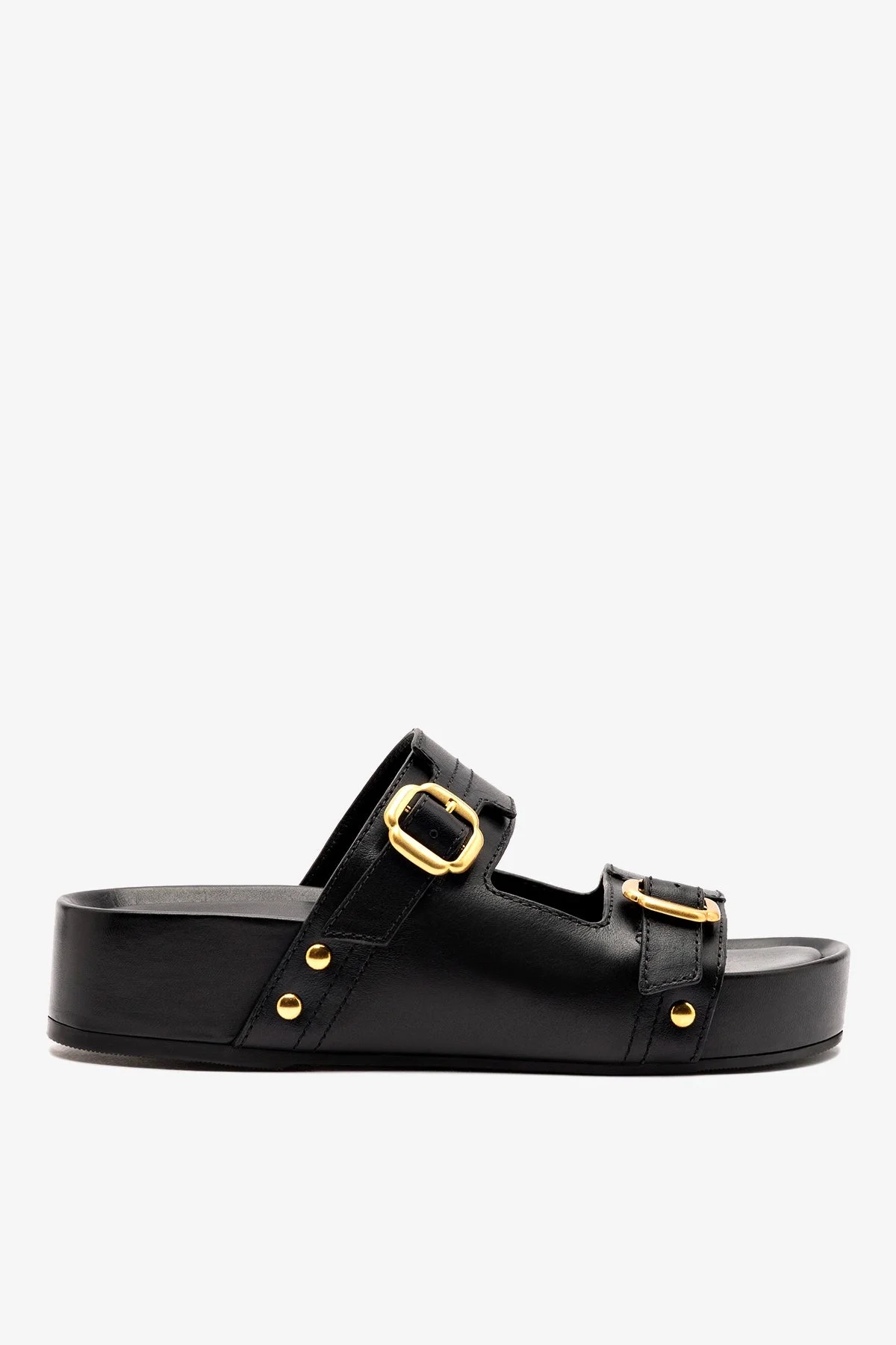 Meet the Milan Sport Flatform—a bold, easygoing slide built for everyday comfort. With wide straps, oversized buckles, and a lightweight platform, it delivers a clean, modern look with just the right amount of attitude. Wear it with relaxed denim, cargo pants, or a simple tank dress for an effortless off-duty vibe. - Black - Vegetale leather upper - Kid skin leather lining - Open round toe - Gold hardware - 44 mm (1.7 in) heel - 33 mm (1.3 in) platform - Perfectly fitted rubber sole for support, durability, and comfort - Insole with Larroude Cloud memory foam cushion and hot stamp logo - Handmade in Brazil - SKU: L557-MILA-BLAC-2508