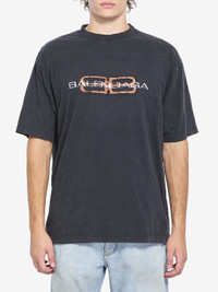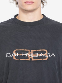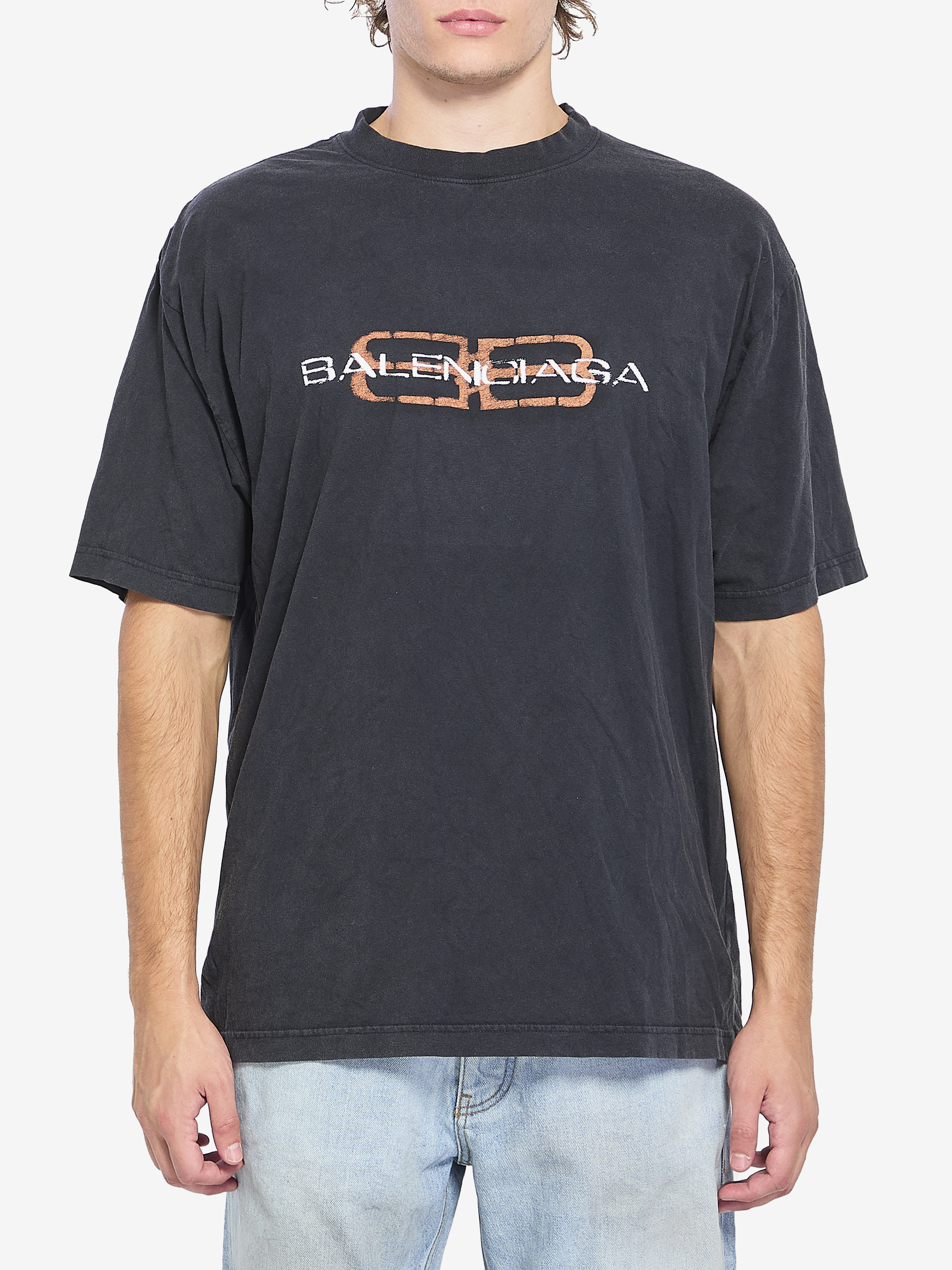 Black cotton T-shirt with delave faded effect. Features ribbed crew neck, ribbed sleeves, BB Balenciaga print on the front. Crinkled effect. Oversized fit. The model is 189 cm tall and wears size L. More Info Product Number : 557174 Product Code : 764235TTVD61041 The model is 189 cm tall and wears size L. Composition : 100% cotton; trim: 99°% cotton, 1% elastane Made in: Portugal