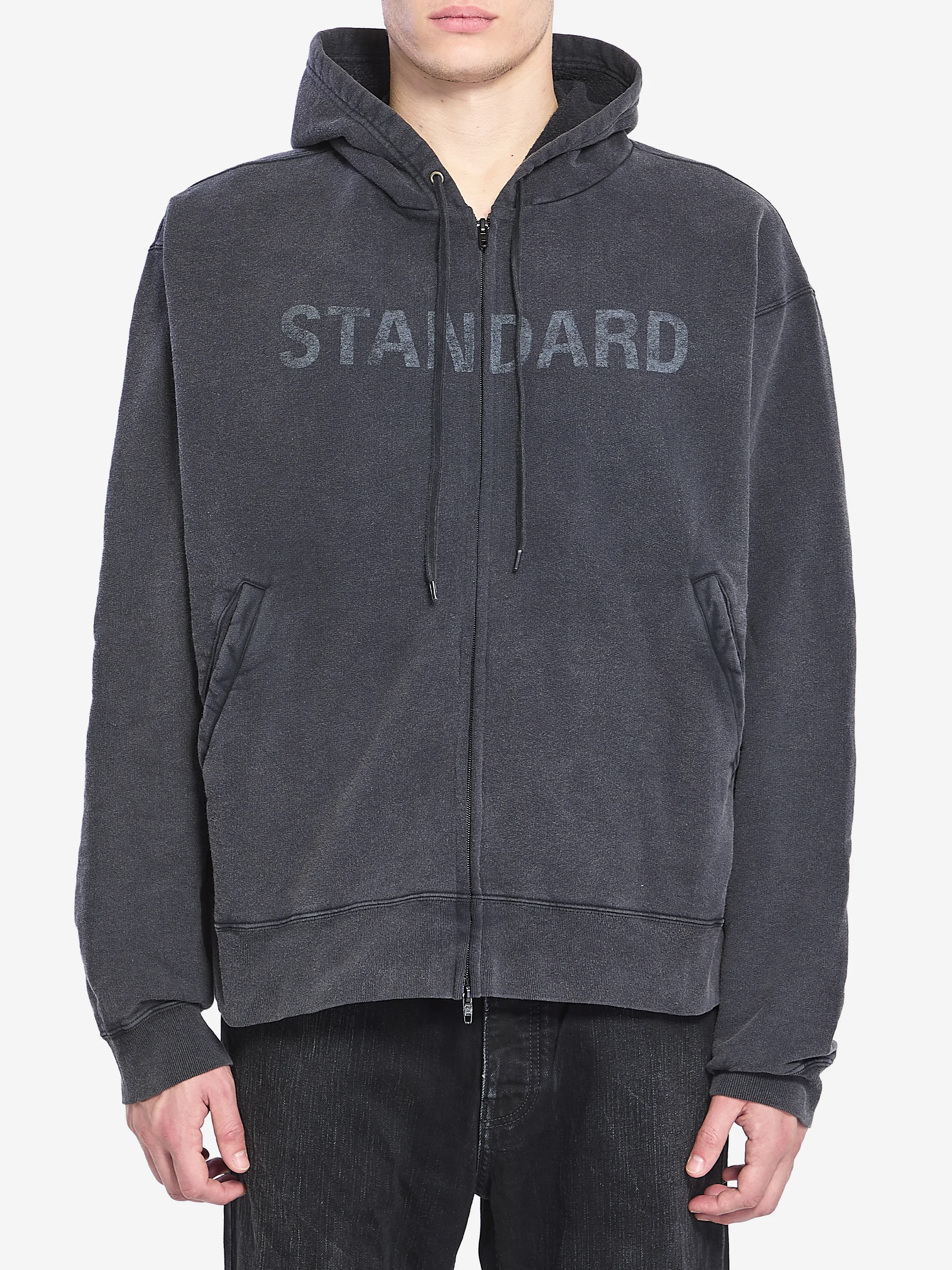 Standard oversized zip-up sweatshirt in faded black cotton fleece. Features a fabric drawstring hood, front zip closure, two side pockets, “Standard” print on the chest, long sleeves, and ribbed cuffs and hem. Faded effect. Oversized fit. The model is 189 cm tall and wears size L. More Info Product Number : 49754 Product Code : 850338TTVC81041 The model is 189 cm tall and wears size L. Composition : 100% cotton Made in: Portugal