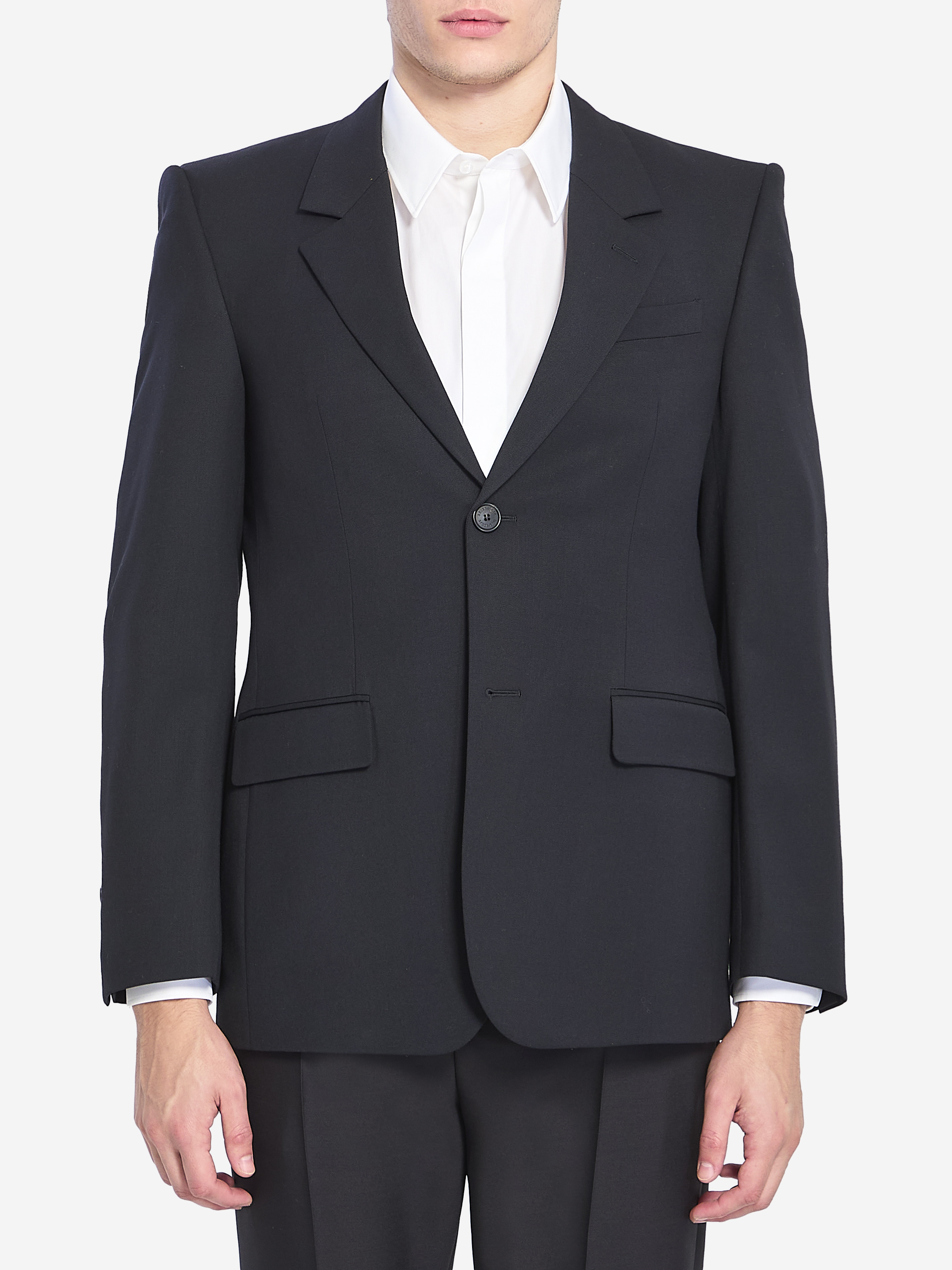 Tailored jacket in black wool. Features peak lapels, single-breasted front closure, long sleeves with buttoned cuffs, two flap pockets on the front, a welt chest pocket, and a single back vent. Fully lined in custom cupro. Regular fit. The model is 189 cm tall and wears size 48 IT. More Info Product Number : 8612618 Product Code : 850759TPT071038 The model is 189 cm tall and wears size 48 IT. Composition : 100% wool; lining: 100% cupro Made in: Italy