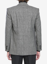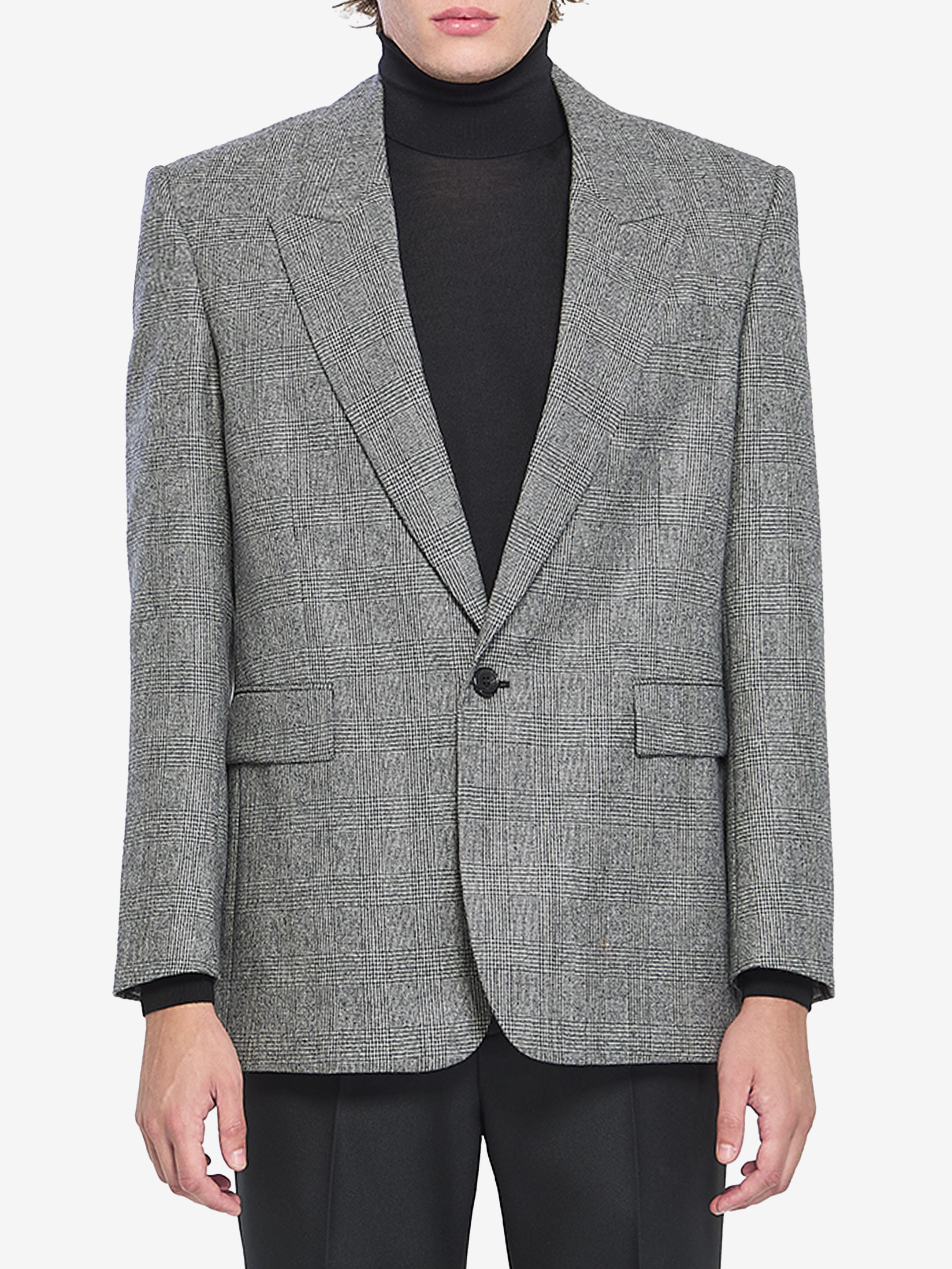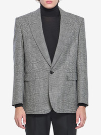 Single-breasted wool flannel jacket with black and white Prince of Wales pattern. Features notch lapels, one-button closure, two welt pockets with flaps on the front, a piped chest pocket, buttons on the cuffs, and a vent at the back. Relaxed elongated fit. The model is 189 cm tall and wears size 50 IT. More Info Product Number : 6179999 Product Code : 837196Y5H541095 The model is 189 cm tall and wears size 50 IT. Composition : 100% wool; lining: 100% silk Made in: Italy