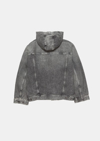 Hooded denim jacket in washed black features a mid-tone eco wash with rags and tied effects on loose black denim. Relaxed unisex fit Hip length Branded button closure Chest pockets Welt pockets 82% Cotton 18% Lyocell Made in Italy.
