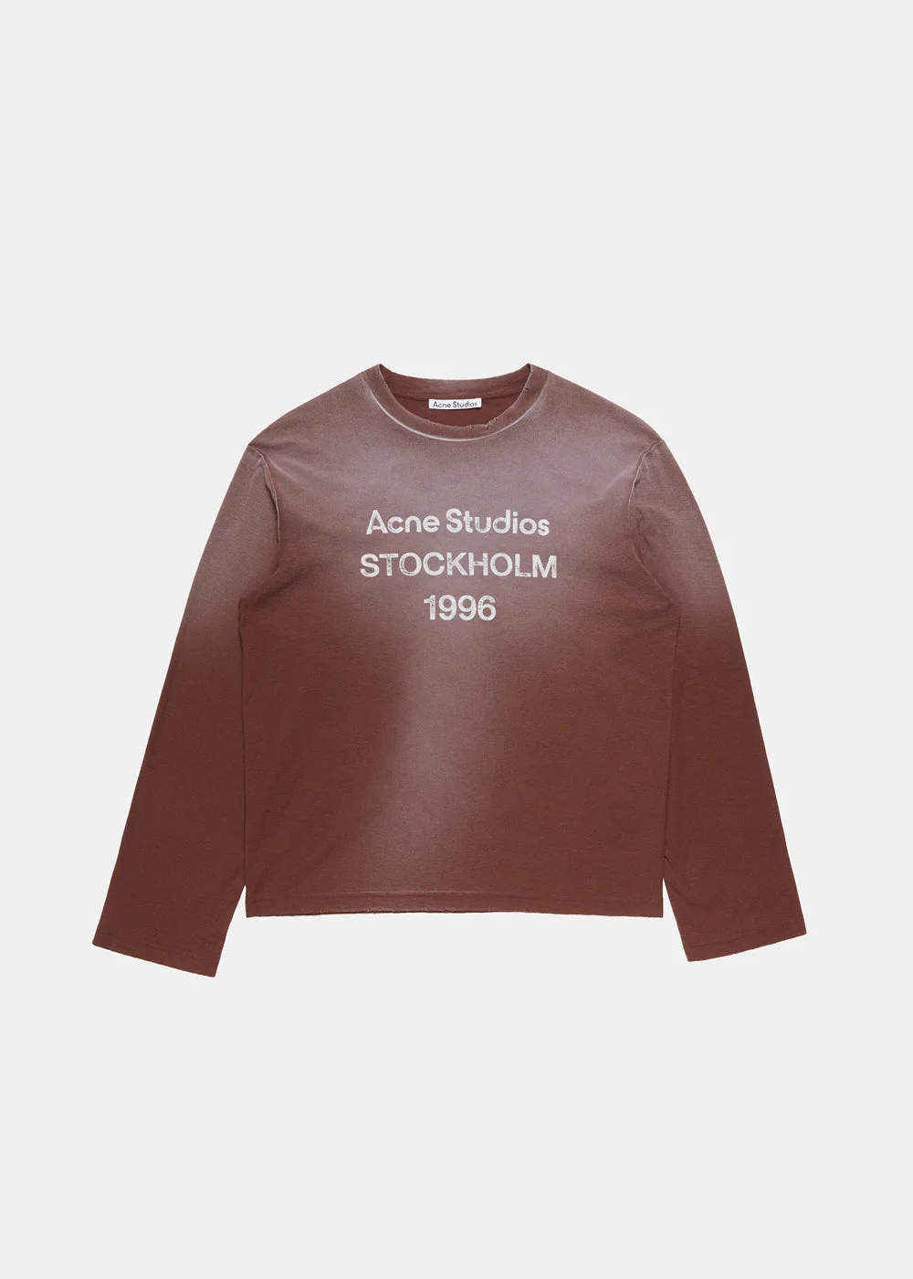 Long-sleeve crewneck T-shirt crafted from irregular jersey, piece-dyed with a vintage spray, and finished with distressed ribbing at the neckline, cuffs, and hem. Made from organically grown cotton, each piece develops a unique appearance. Features the Acne Studios 1996 logo print on the front. Cut to a relaxed unisex fit with hip length. Relaxed unisex fit Hip length Sprayed finish Stamp log Distressed neckline Cuffs and hem 85% Cotton 15% True hemp Made in Portugal.
