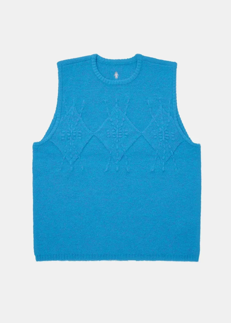 Crew-neck knitted vest in sky blue. Jacquard pattern Crew neck Sleeveless 67% Polyester 25% Nylon 6% Wool 2% Elastane Made in Korea.