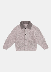 Textured-collar elbow-patch cardigan in purple. Textured panel Front button fastening Classic collar Elbow patches 75% Wool 25% Nylon Made in Korea.