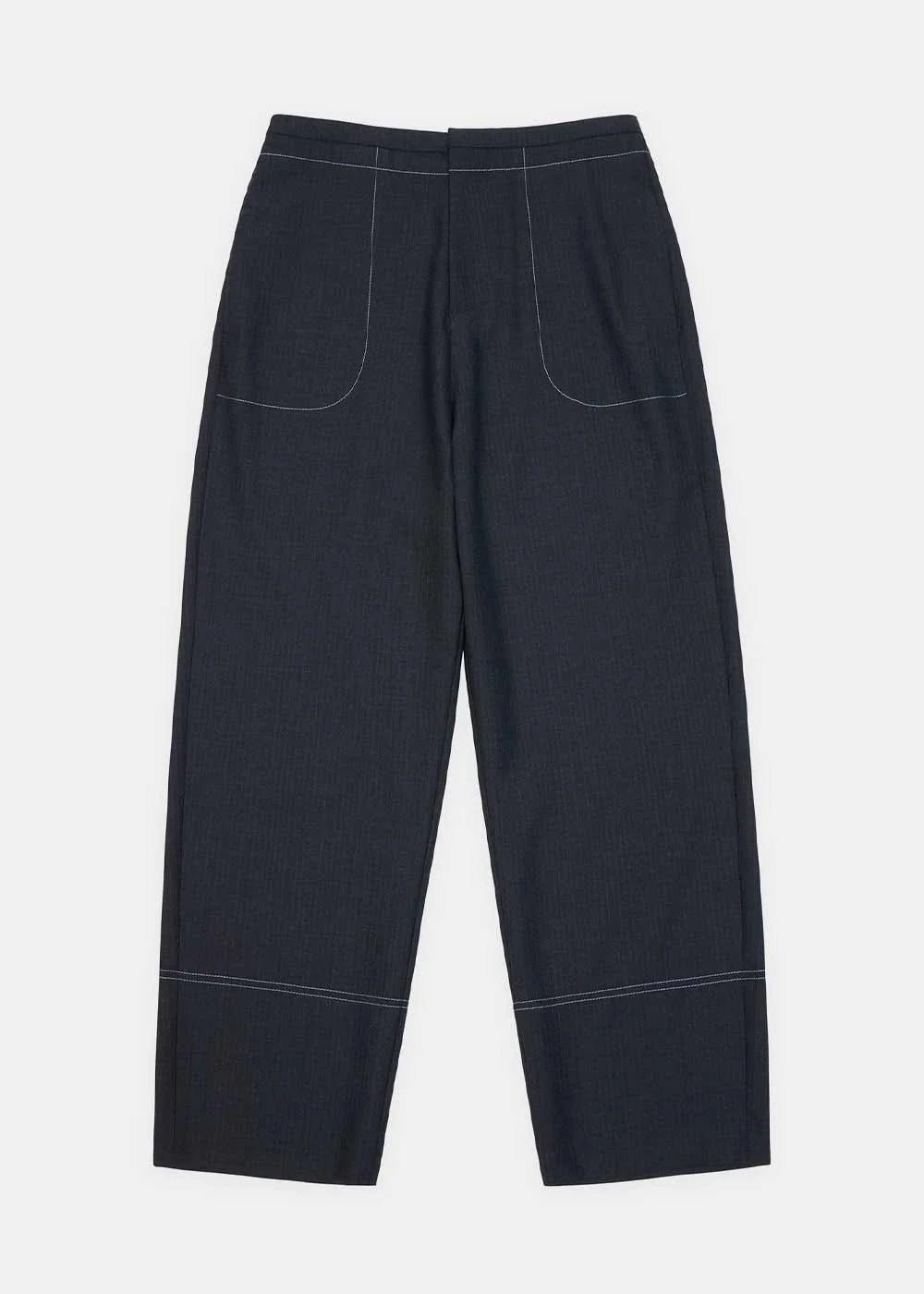 Regular fit slacks in grey. Mid-rise Zipper, hook and eye closure Slim waistband Contrast stitching Tetraight embroidery at the back Fringed label and embroidery at the back 80% Wool 15% Polyester 15% Cashmere Made in South Korea.