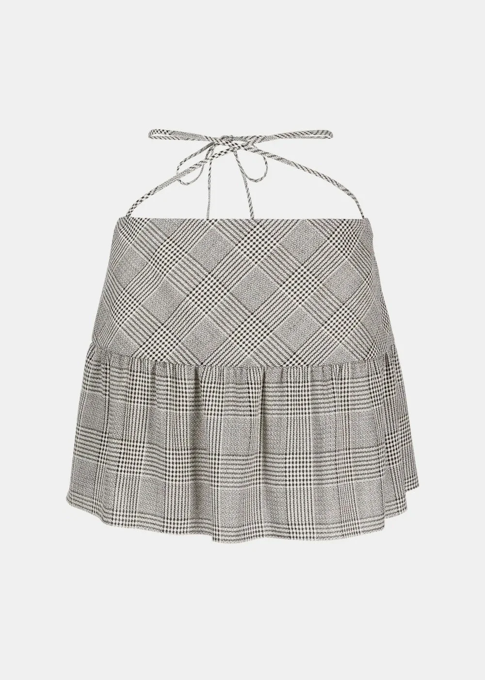 Virgin wool mini skirt in grey with Prince of Wales check pattern. Lace-up detailing Thigh length Low waist Outer: 100% Virgin Wool. Lining: 100% Viscose. Made in Italy.